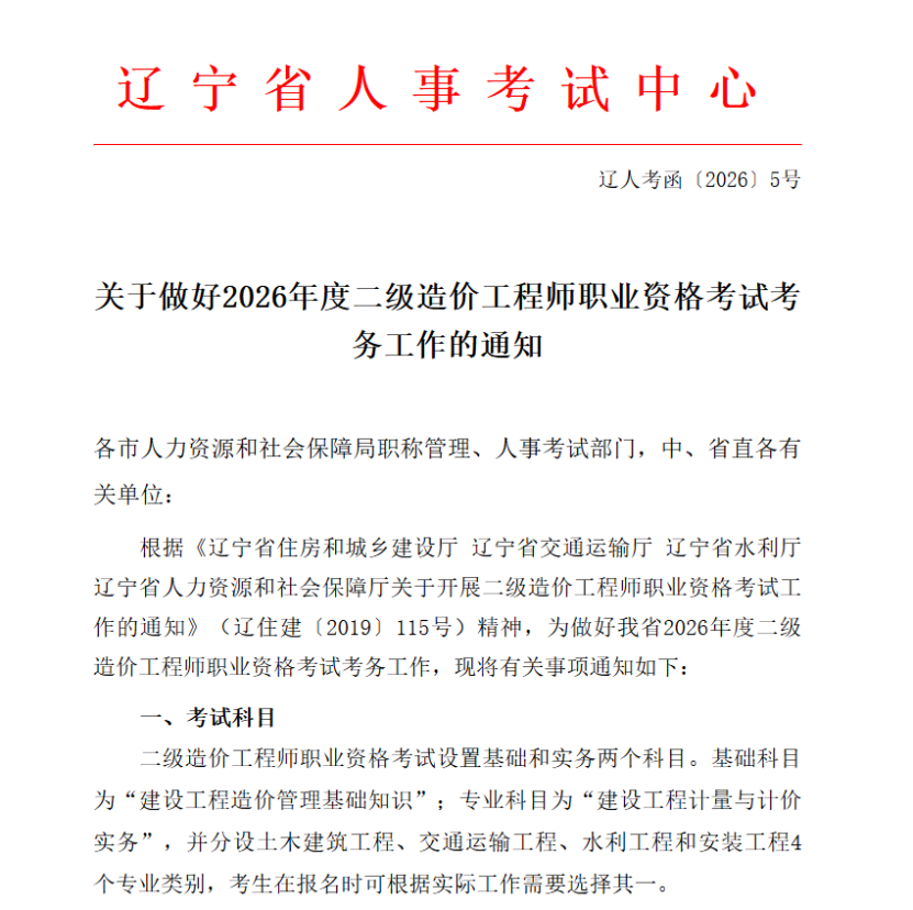 本站讯:根据《辽宁省住房和城乡建设厅辽宁省交通运输厅辽宁省水利厅辽宁省人力资源和社会保障厅关于开展二级造价工程师职业资格考试工作的通知》(辽住建〔2019〕115号)精神,为做好我省2026年度二级造价工程师职业资格考试考务工作,2月24日,辽宁省人事考试中心发布考务通知,明确2026年度辽宁省二级造价工程师职业资格考试定于4月26日举行。